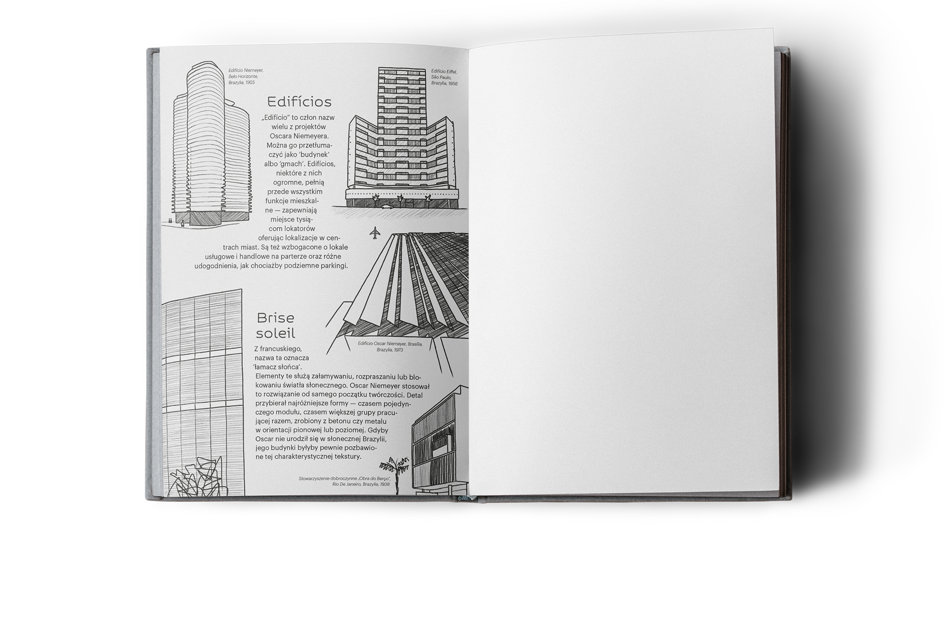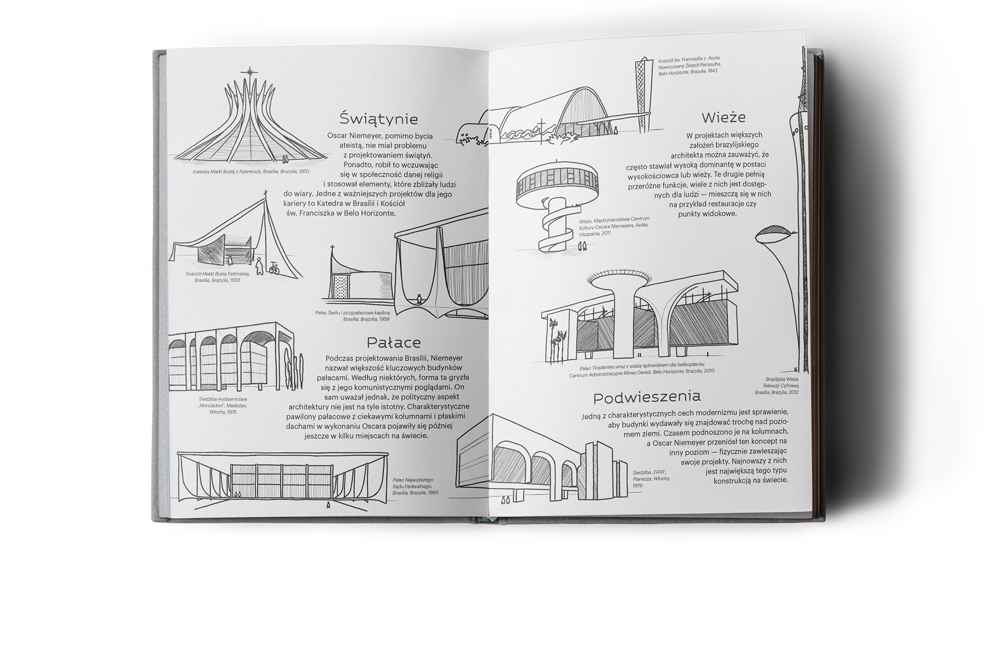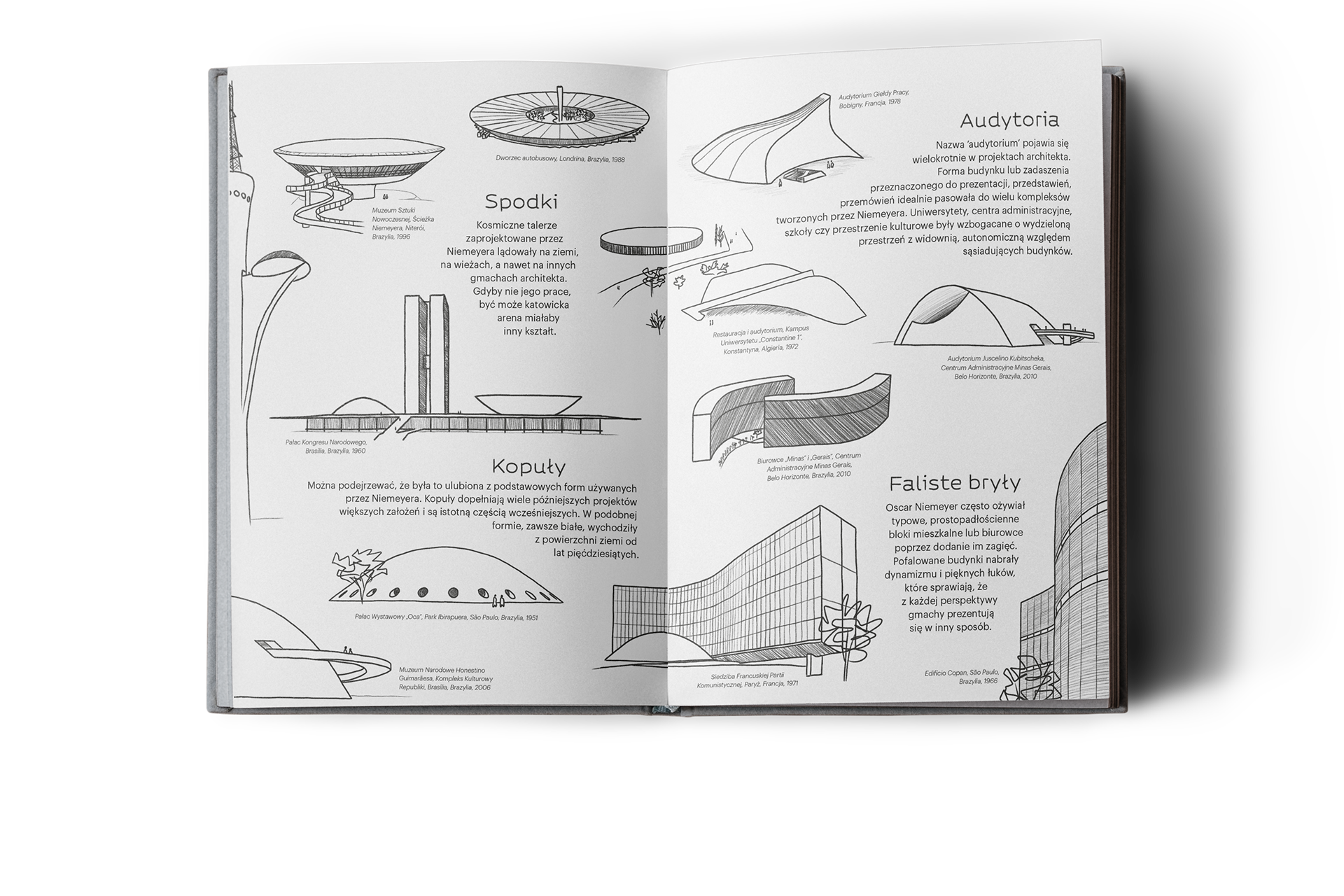 My input into a collective publication about design. It portrays the architectural work of Oscar Niemeyer by putting his buildings into open categories like "Palaces", "Temples" or "Saucers".