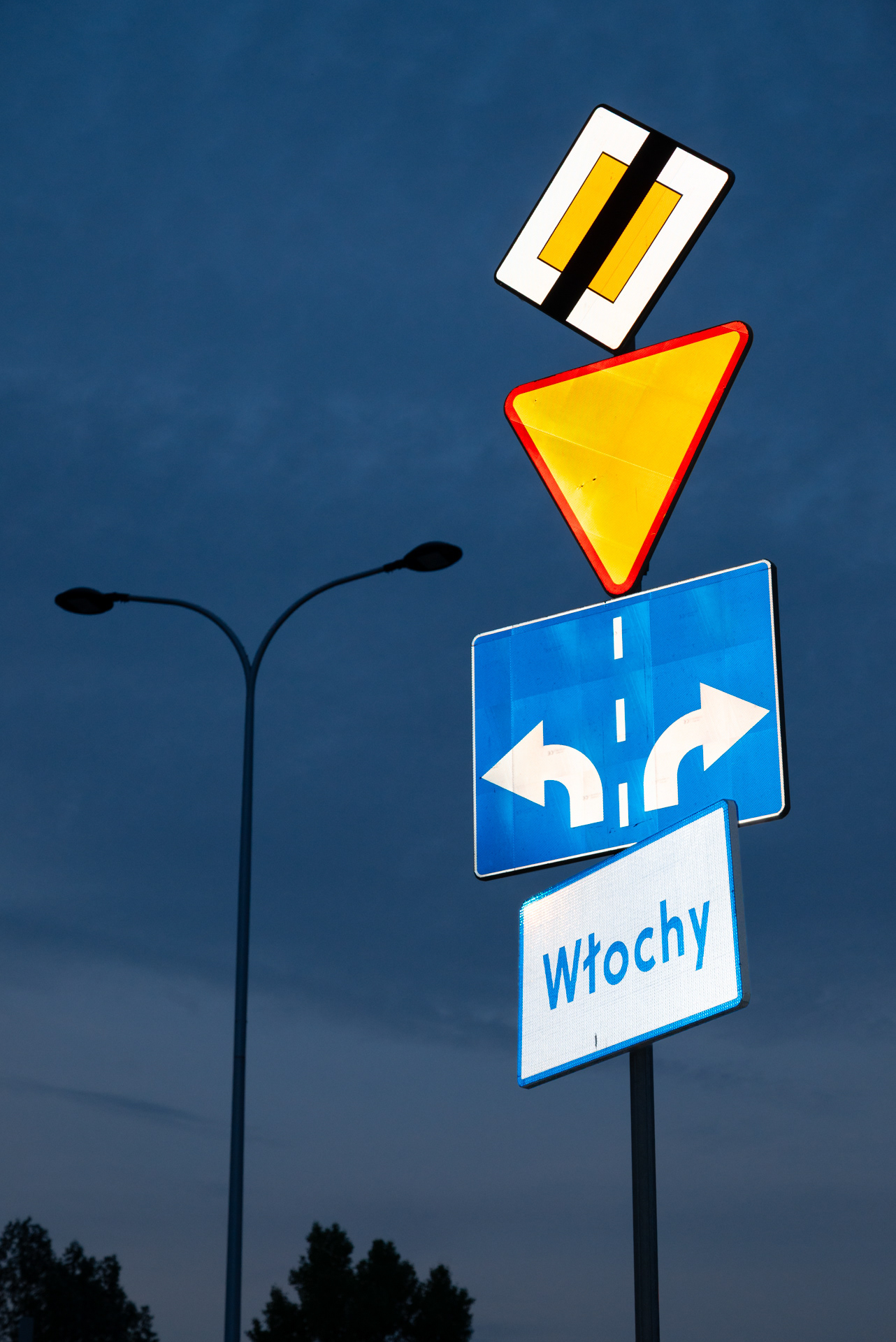 In the "Totems-21" photoseries, I document the juxtaposition of various road signs with signs bearing the names of Warsaw’s districts (code-named E-21). Ignoring the semantic layer of meaning, I see them as abstract, graphic welcome signs, and going a step further—district totems.